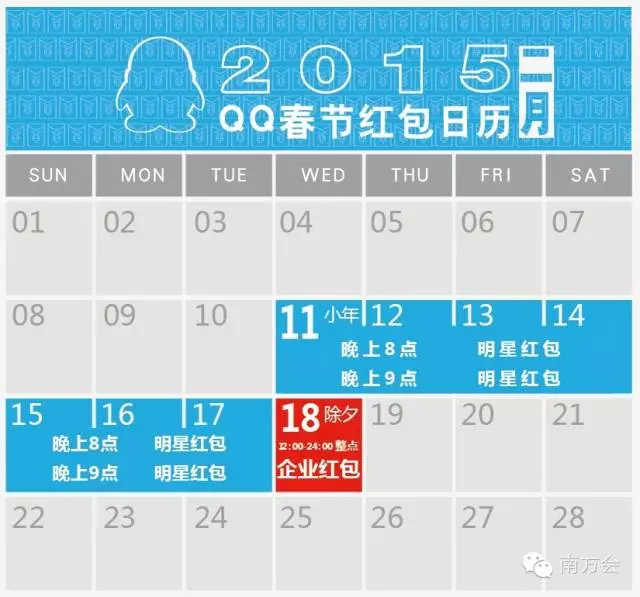 在除夕,QQ将会联合企业一起为所有用户疯狂发福利。每个账号每个时段整点可以抢一次企业红包,机会不可积累。
