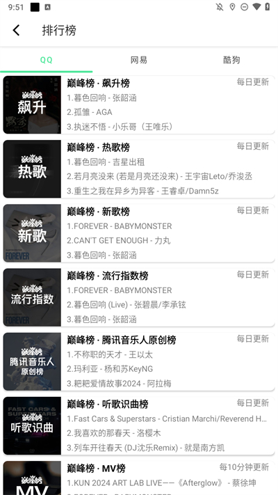 3、点击排行功能能够看到许多精彩的热门资源内容,让你尽情的在线搜索更多热门的歌曲榜单内容等;