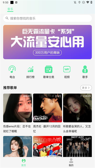 1、首先打开下载好的音乐软件,进入里面后可以看到许多的热门音乐歌曲可以点击聆听;