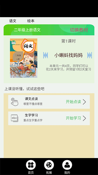 结构清晰,一目了然:首页按年级→学期→单元→课文四级导航,点击即达;每课细分为【听课文】【读课文】【学生字】【学作文】【听故事】五大功能区,学习路径不迷路。