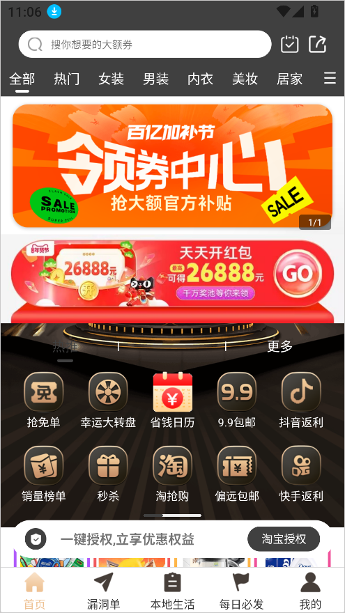 聚焦平台严选的超低价爆品,包含限时秒杀、成本价清仓、平台补贴款等特殊优惠,价格极具冲击力。