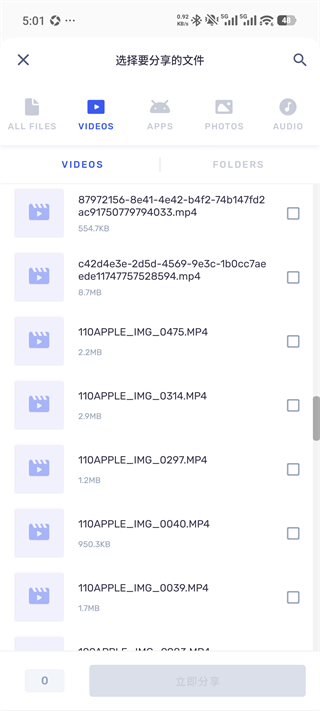 4、点击“发送”后,进入文件选择勾选要传输的视频文件。