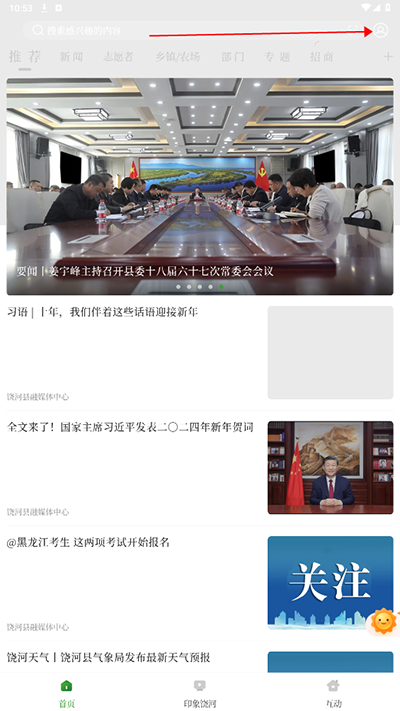1、打开饶河融媒APP,点击底部导航栏【我的】;
