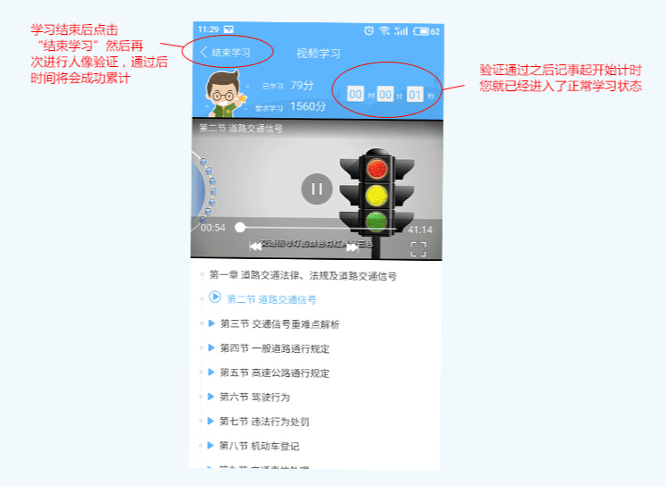 进入【理论学习】模块 → 完成人脸验证(仅首次需操作)→ 页面显示实时计时器(00:00:00)即代表系统已开始记录有效学时。学习过程全程受监管,确保学时真实有效,顺利对接驾培监管平台。