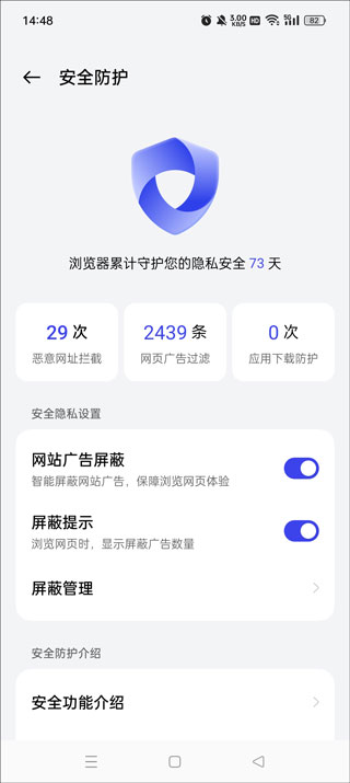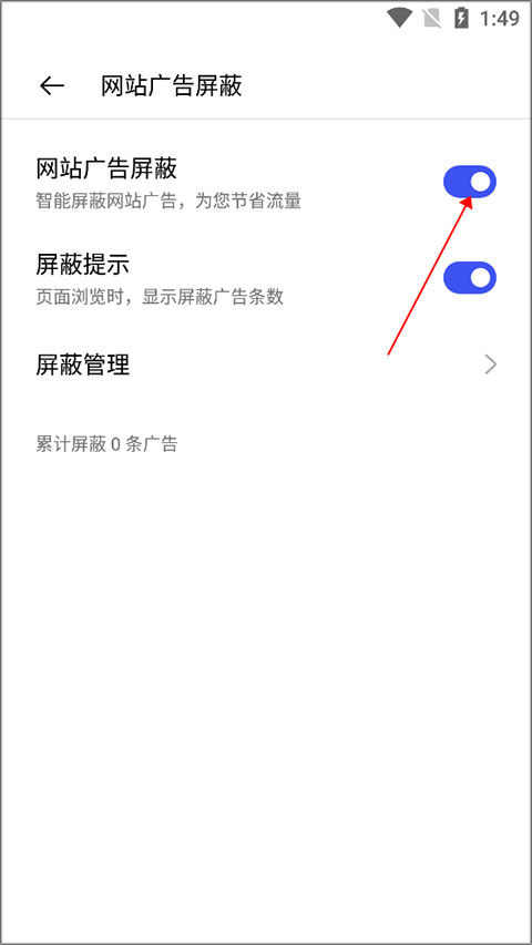 进入首页底部菜单栏→【设置】→【网站广告屏蔽】,开启后即可智能拦截网页弹窗、贴片及信息流广告,大幅提升阅读沉浸感与页面纯净度。