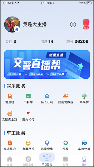 3、进入【服务】中心,按需切换「车主服务」与「娱乐生活」双模式:查实时高速路况、查车辆违章、看主播热度榜、查附近停车场,一站式满足出行刚需与精神需求。