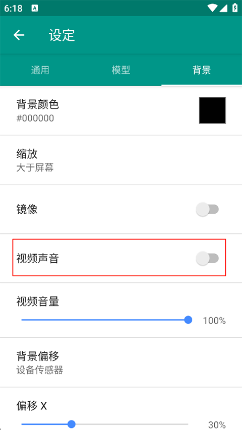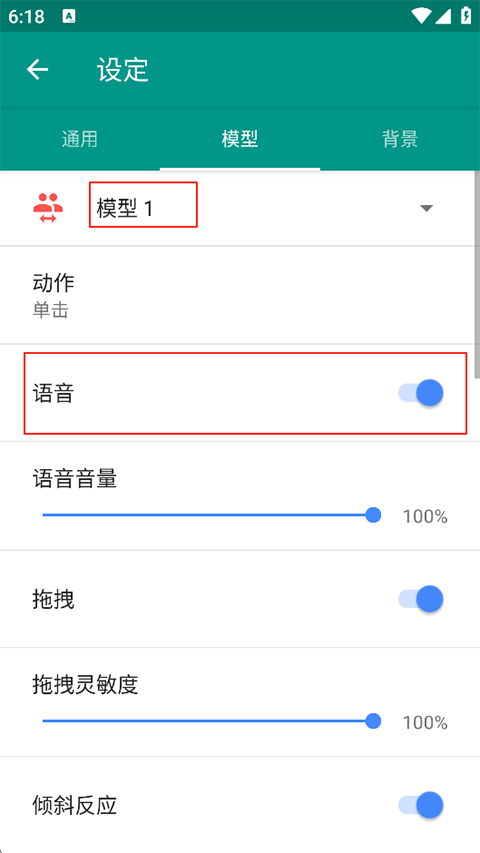 3、在【模型】页开启【语音】开关(即角色配音);在【背景】页开启【视频声音】开关(即背景音效/音乐);