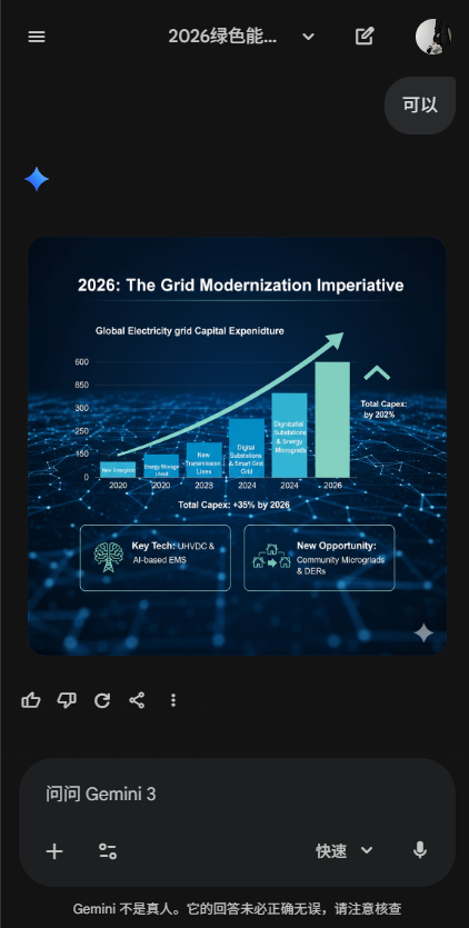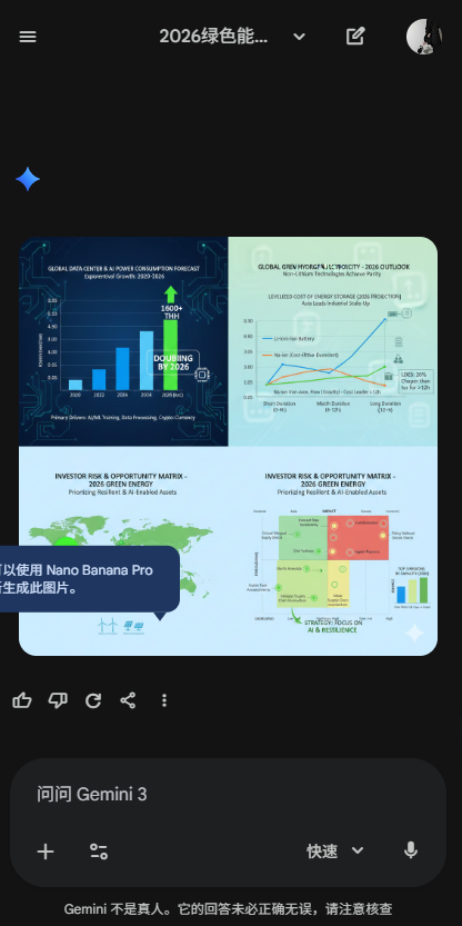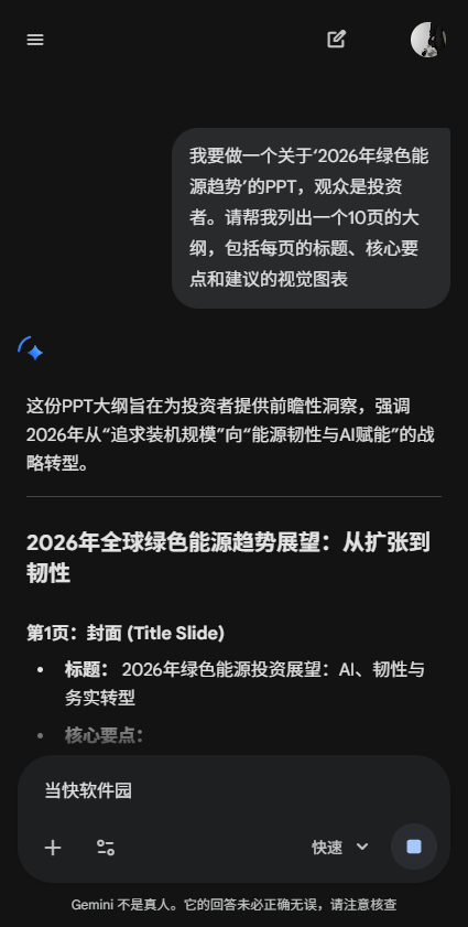 只需输入:“我要做一个面向投资者的‘2026年绿色能源趋势’PPT,10页,每页含标题、核心要点及图表建议”,Gemini 即输出逻辑严密、数据导向的完整框架,包括可视化类型推荐(如柱状图比对各国装机量、热力图展示技术成熟度),所有内容均可直接编辑复用。