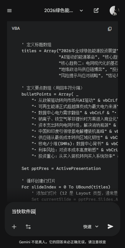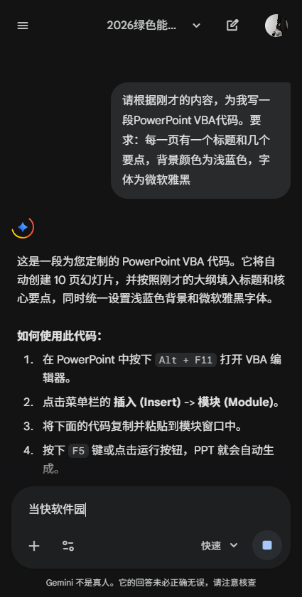 让Gemini为你编写可直接运行的PowerPoint VBA脚本——指定字体(微软雅黑)、背景色(浅蓝)、层级结构后,复制粘贴至Alt+F11打开的VBA编辑器,按F5执行,10页标准化幻灯片瞬间生成,格式统一、布局规范,省去手动排版全部耗时。