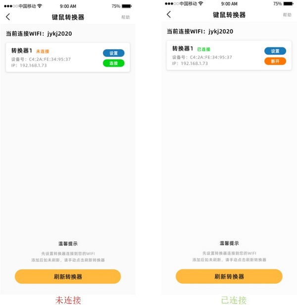 授权后,若转换器未刷新出来,请点击【刷新转换器】,多点几次!(热点名称、密码和AP频段没有设置错误就一定能连上。)