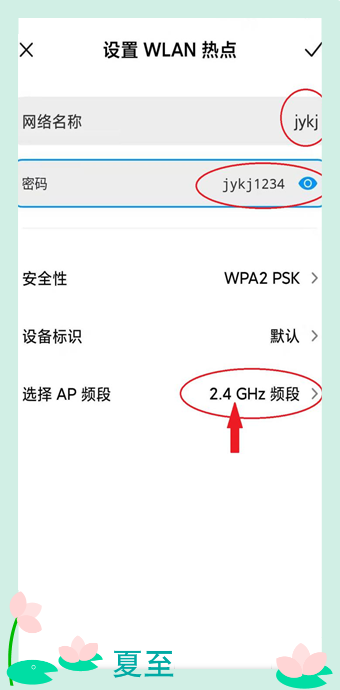 设置个人热点。网络名称设置为jykj这四个字母,密码输入:jykj1234。AP频段选择2.4Ghz或5Ghz均可。