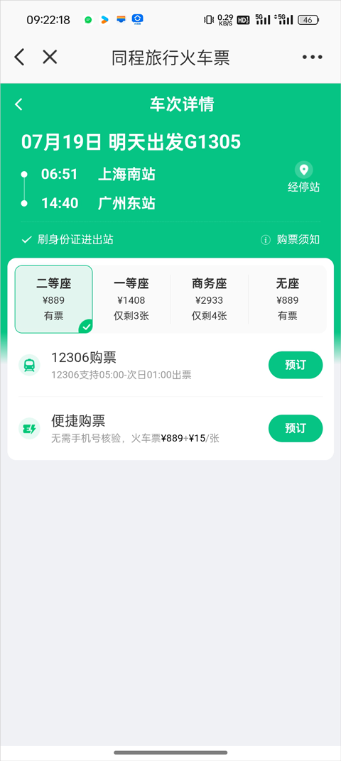 5、从查询结果中选择合适的车次,进入订单确认页面。