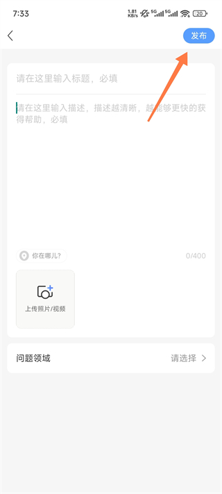3、选择问题所属领域,填写具体内容后点击“发布”。