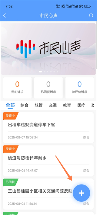 2、在页面右下角点击【+号】按钮,进入诉求发布界面。