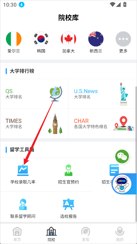 - 在院校页面中,点击【院校录取率】功能。