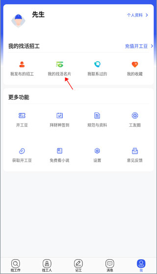 1、打开并登录App,进入“我的”页面,点击“我的找活名片”功能入口。