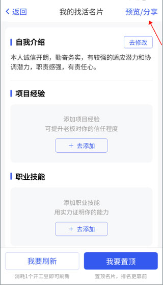 3、设置完成后,可进一步完善个人信息,如项目经验、职业技能等,并支持将个人名片分享给好友或工友。