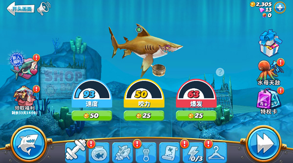 解锁专属装备和小工具,提升鲨鱼的能力,让它更加强大。无论是坚固的牙齿、更快的速度,还是炫酷的外观,都可以随心所欲地打造属于你的终极猎手。