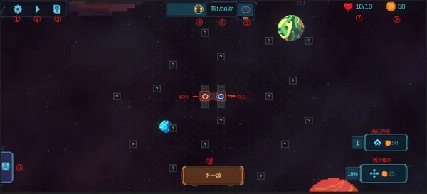 10、下一波:开始战斗的信号。点击后无法再进行构建、合成重构塔等操作仅能点击重构塔进行升级,需考虑后谨慎点击