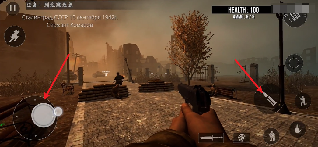3、进入战斗界面,使用屏幕左侧摇杆控制角色移动,右侧子弹图标为射击按钮。(左上角的辅助按键可实现朝面朝方向独立移动,小子弹图标旁边的按钮为跳跃键)