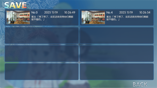游戏内置智能多存档系统,点击界面下方箭头即可即时保存。每个存档自动标注时间戳、当前章节名及关键对话摘要,支持一键读取、覆盖重存、独立命名,助你轻松驾驭多周目攻略,不错过任何一条隐藏线。