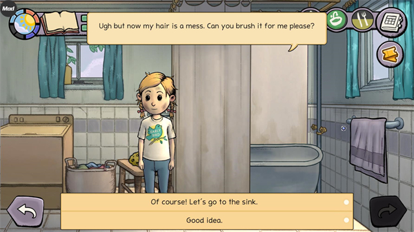 6、界面右上角显示着孩子的三项状态:娱乐、清洁和饥饿。你需要合理安排活动,确保它们保持在正常范围,避免出现红色警示。