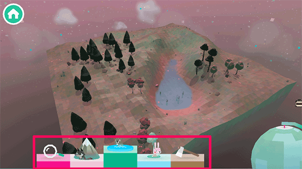 2、下方工具栏从左到右的分别是放大镜,可以放大地图上的物品;地形工具,随机出现动物;湖泊改造工具,可以随机出现水生动植物;种树可以选择出现的动物类型;砍树。