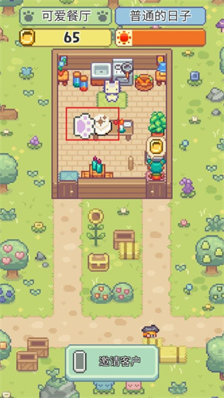 点击【开店铺】按钮,餐厅就会正式营业喵,如果想吸引更多客人光顾,可以点击【邀请客户】按钮,让更多顾客进门用餐喵。
