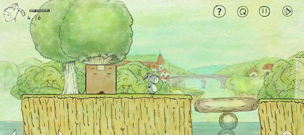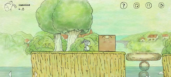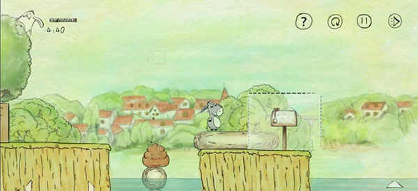 第二步:用箱子砸开挡路的大便,再把草堆推入水中。等草堆浮起成临时浮桥,迅速把箱子扔到对岸,随后操控小毛驴跳上草堆游过去。