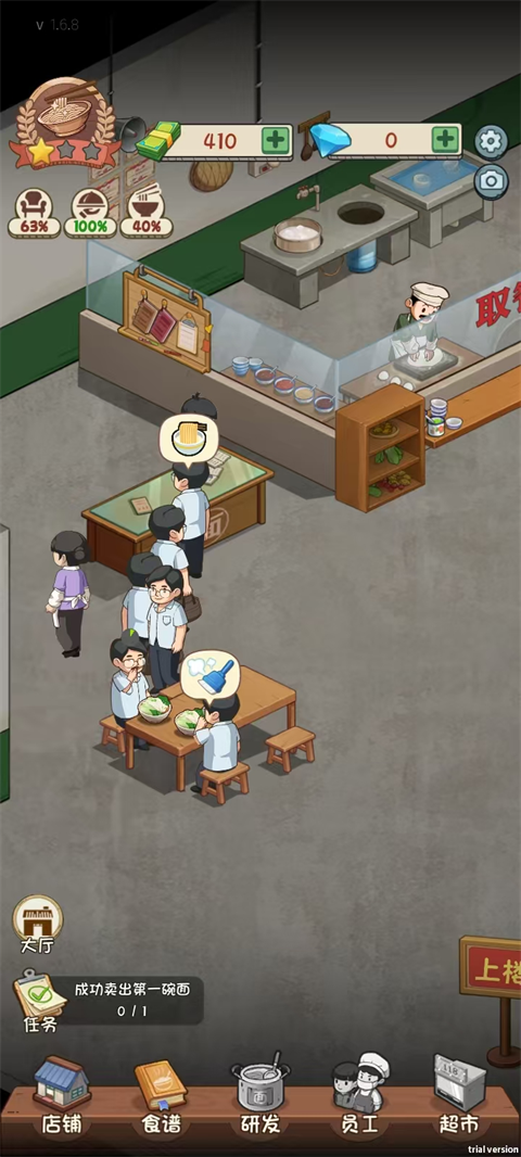 您将深度参与面馆运营的全生命周期:设计菜单、研发食谱、采购食材、调度人手、优化动线、升级设备……每一个决策都影响口碑、营收与角色关系。没有固定套路,只有无限组合——今天为素食客人定制青酱宽面,明天为节日庆典推出限定龙虾捞面,后天还要赶在暴雨前抢收后院刚成熟的罗勒叶。