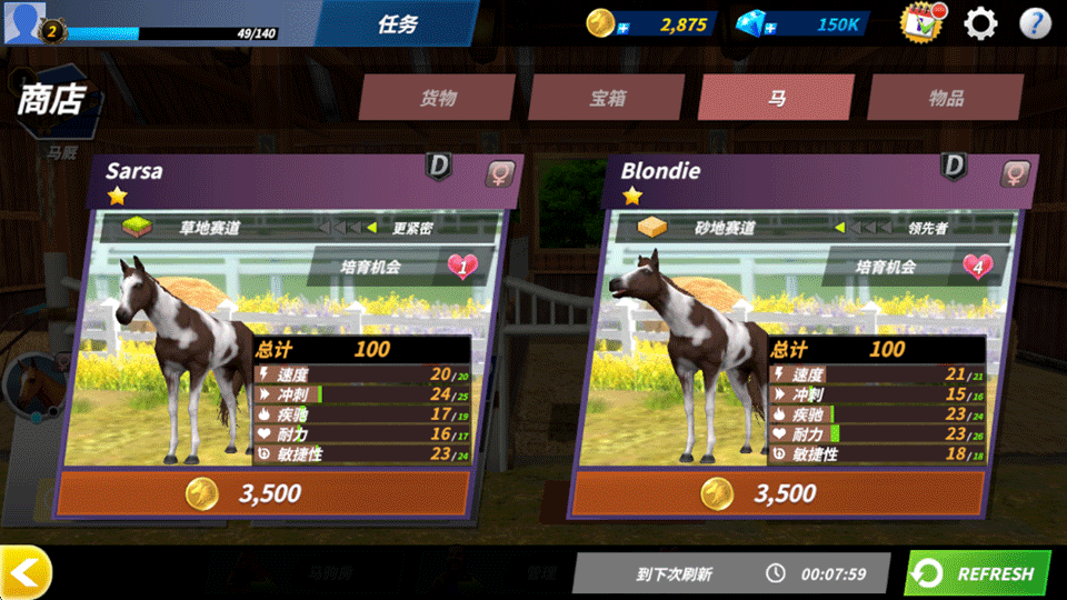 一匹冠军马的背后,是科学繁育与长期投入:马匹等级越高、累计奖金越丰厚,繁育优质后代的概率越大;每匹马均拥有独一无二的外观、天赋属性、成长曲线与适配跑法(领跑者/紧跟者/中间者/接近者);若想快速扩充阵容,也可直接通过游戏商店选购潜力新驹,灵活适配不同赛事需求。