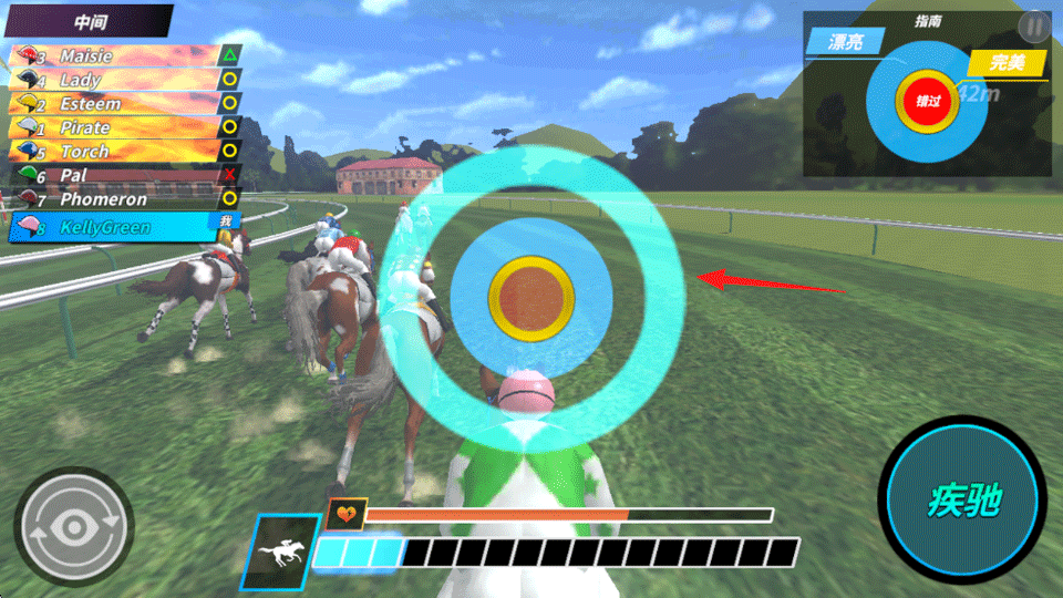 赛前准备至关重要:为爱驹升级属性、装配专属装备,确保战力满格;比赛中,精准把握节奏——当圆圈滑至蓝色标线时点击屏幕,力求稳定停驻于黄色判定区,达成完美操作;每次成功将累积能量条,蓄满后点击右侧“疾驰”按钮,瞬间爆发冲刺,实现弯道超车!