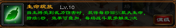 生命绽放,回复型技能,满级后在主将收到武力伤害时获得每秒5%最大生命值的回复,持续5秒。每场战斗能出发两次。变相为武将提升了25%的血量,但应对智将无用,一般都需要被小兵攻击后触发。应对场合较多,是比较万金油的一个技能。