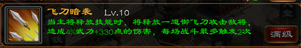 飞刀暗袭,伤害型技能,满级后效果在主将释放技能的时候给予对方4%武力+330点的伤害,每场战斗最多触发两次。伤害相交冰爆稍低,但贵在能主动释放,相当于头两次所有技能都都附带了额外的伤害,适合追求秒人的武将使用。