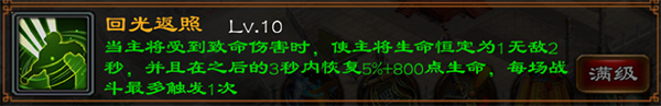 回光返照,这个技能就是杨威将军作为第一副将的理由所在,信春哥,得永生,原地复活不要更爽!在主将受到致命伤害的时候获得2秒无敌,并在3秒内回复5%+800的生命值。从此再也不怕被秒杀了!绝地反攻再也不是梦!
