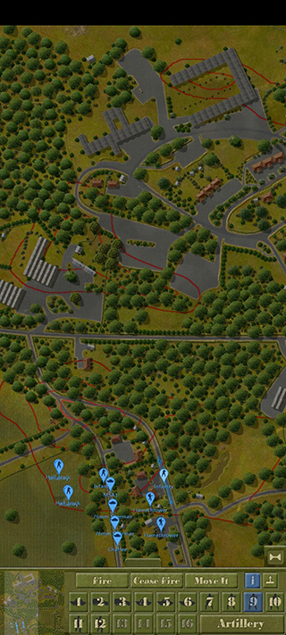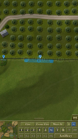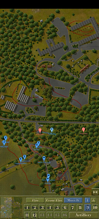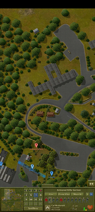 4、由图可见,这种情况非常危险。我方的余回部队被发现,但由于处于丛林复杂环境没有被交叉火力压制,我决定让他强行进攻,并派遣m5a1进行支援,地图最左端的机械步兵则进行大于回穿插,机械步兵团的位置被遮蔽物环绕,不用担心遭到火力打击。
