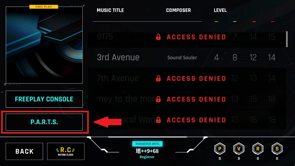 想定制专属视听体验?进入左下角【P.A.R.T.S】区域,即可实时更换按键样式、滑轨特效、点击粒子、背景动画(BGA)及动态背景图(BGE)——你的打歌界面,由你定义。