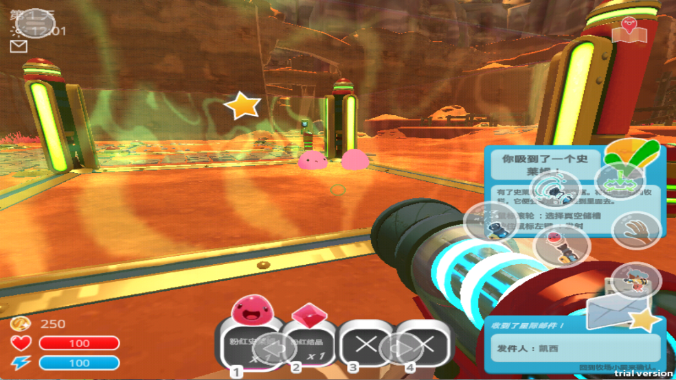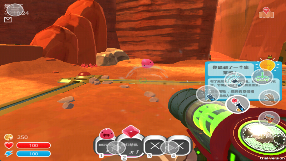 对准粉色史莱姆,使用史莱姆枪的【吸附】功能将其吸入。捕获成功后,可在下方快捷栏中选择合适的位置进行存放,便于后续管理与饲养。