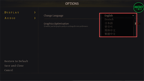 2、在 “OPTIONS” 设置页面中,找到 “Change Language” 语言选项,展开下拉菜单并选择 “简体中文”。