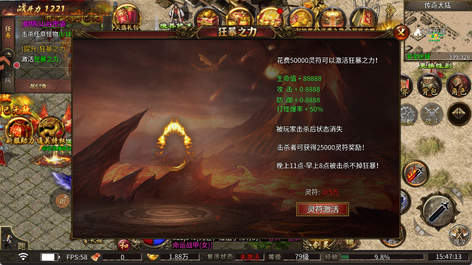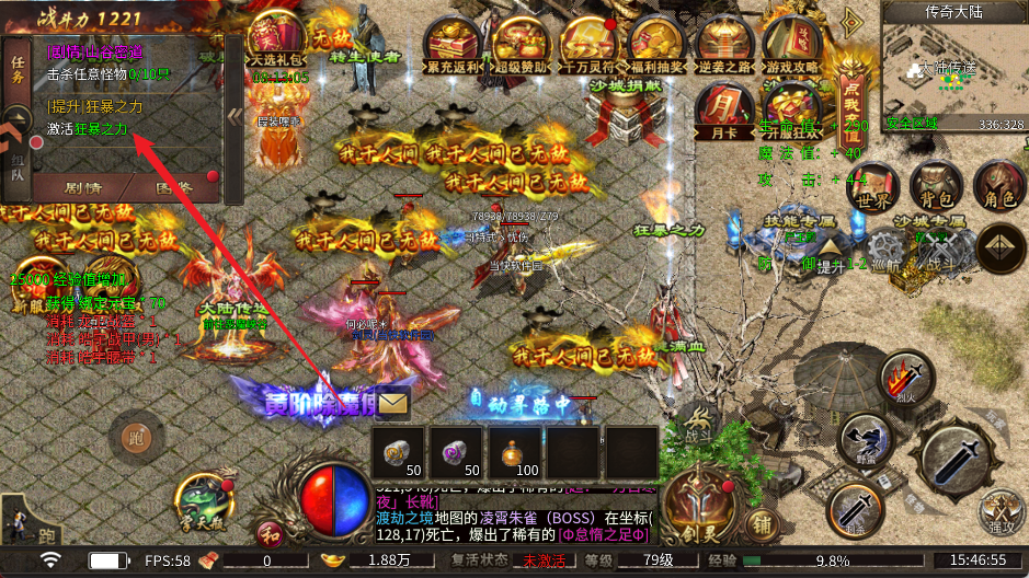 3、攒够资源立刻开启【狂暴之力】——属性全面提升,更关键的是爆率同步飙升,投入产出比超高!