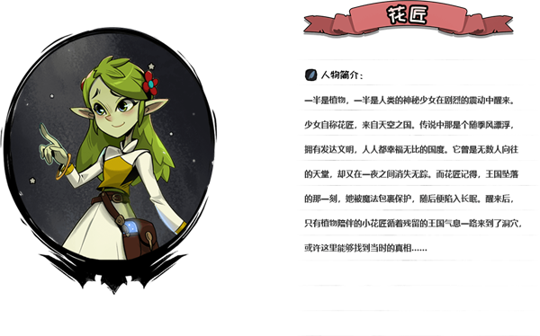 花匠 半人半植的沉睡少女,来自一夜坠毁的天空之国。苏醒后唯有植物低语相伴,循着残存气息踏入洞穴,只为揭开王国湮灭的真相。
