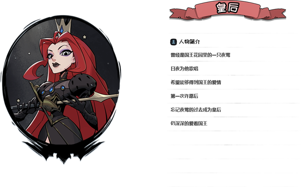 皇后 昔日国王花园里婉转歌唱的夜莺,第一次许愿后遗忘本源,成为深爱国王却无法被真正看见的皇后。
