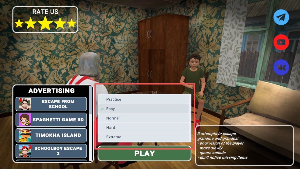 《逃离家暴2(Schoolboy Escape 2: Village)》是一款沉浸感极强的3D第一人称心理惊悚向逃脱游戏——你将化身一名被强行送往偏远乡村祖宅的少年,在看似平静的田园表象下,直面压抑的控制、无处不在的监视与步步紧逼的生存危机。没有战斗,没有超能力,唯有潜行、观察、推理与时机把握:在祖父母的严密看管与村民的警惕目光中穿梭,搜寻散落的关键道具,破解层层嵌套的环境谜题,最终从这座“温柔牢笼”中夺回自由。