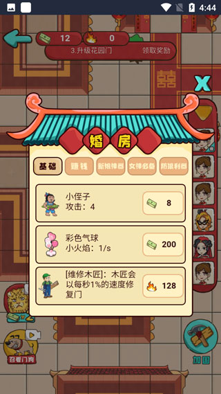 开局二选一:单人闯关 or 多人联机!选择你的身份(俏皮新娘 or 憨憨新郎),躲进专属婚房,通过点击收集金币、升级门锁、部署钉板/电击器/辣椒喷雾等搞怪防御道具,层层加固防线。敌人不是鬼怪,而是执拗冲婚的新郎团——节奏明快、操作简单,但策略深度拉满:资源分配、时机预判、阵型微调,每一轮防守都是脑力+手速的双重狂欢。