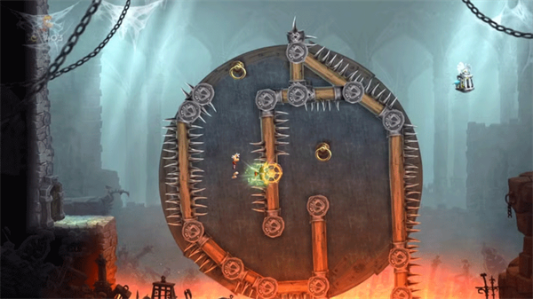 进入地下城新区域后,立足双绳平台。同步剪断两绳使平台下沉,再剪第三绳释放左侧尖柱。跃至柱顶左行,触发隐藏空间获取青少年。