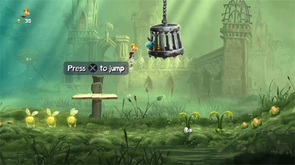 关卡起始向左穿行灌木丛,绕至树后可见悬浮飞行的笼子。紧盯其环绕轨迹,精准起跳攻击即可解救。