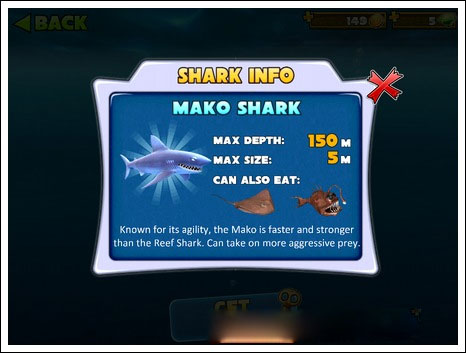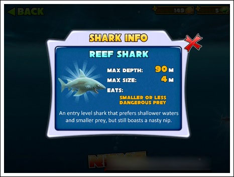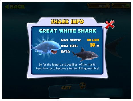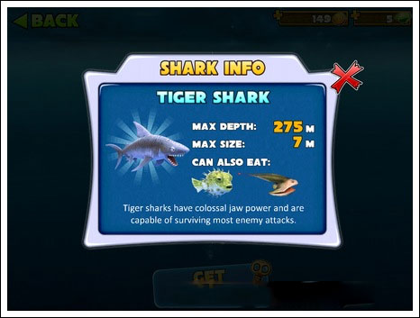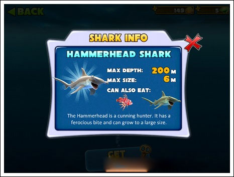 最大深度:200m|最大尺寸:6m|可捕获猎物:红色尖刺鱼、锤头鲨(同类)