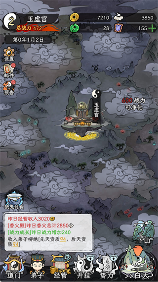 了不起的道门——一款将修仙幻想、宗门经营与黑色幽默完美融合的策略向国风手游!你不是高高在上的仙尊,而是一位从破庙扫地僧起步的“草根掌门”:荒山野岭、断瓦残垣、香火凋零……但只要一纸招徒榜、一把摸骨手、一座黑市摊,就能白手起家,把濒临倒闭的道观,一步步建成威震九州的顶级仙门!资源要精打细算,弟子要慧眼识珠,买卖要暗度陈仓,除魔要顺带摸金——这是一场笑中带谋、稳中带皮的硬核修仙创业记。
