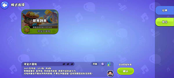 融合轻度射击、跑酷闪避与策略拾取的创新玩法:开局随机空投武器,边跑边捡、边打边躲;支持单排、双排、四人小队,匹配快、节奏爽、局均时长仅5–8分钟;独创“娱乐模式”限时开放——当前主打【寻宝大冒险】,每日10:00–次日4:00限时开启,赢满3局即可领取金币、赛季积分+神秘补给箱(含能量、武器碎片等);前五名即算获胜,零压力也能拿奖励!