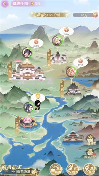 通关主线10-3即启【凰舆全图】——一幅囊括京畿、东南、中土、百越、西域五大区域的立体疆域地图,含15座风格迥异的城池。凰都默认开放,其余地点需通过【凰舆征伐】(PVE挑战)与【戏说凰舆】(剧情关卡)逐步解锁。每座主城(金陵/洛阳/五羊/楼兰)解锁后,对应行宫即刻开放,开启专属功能模块。